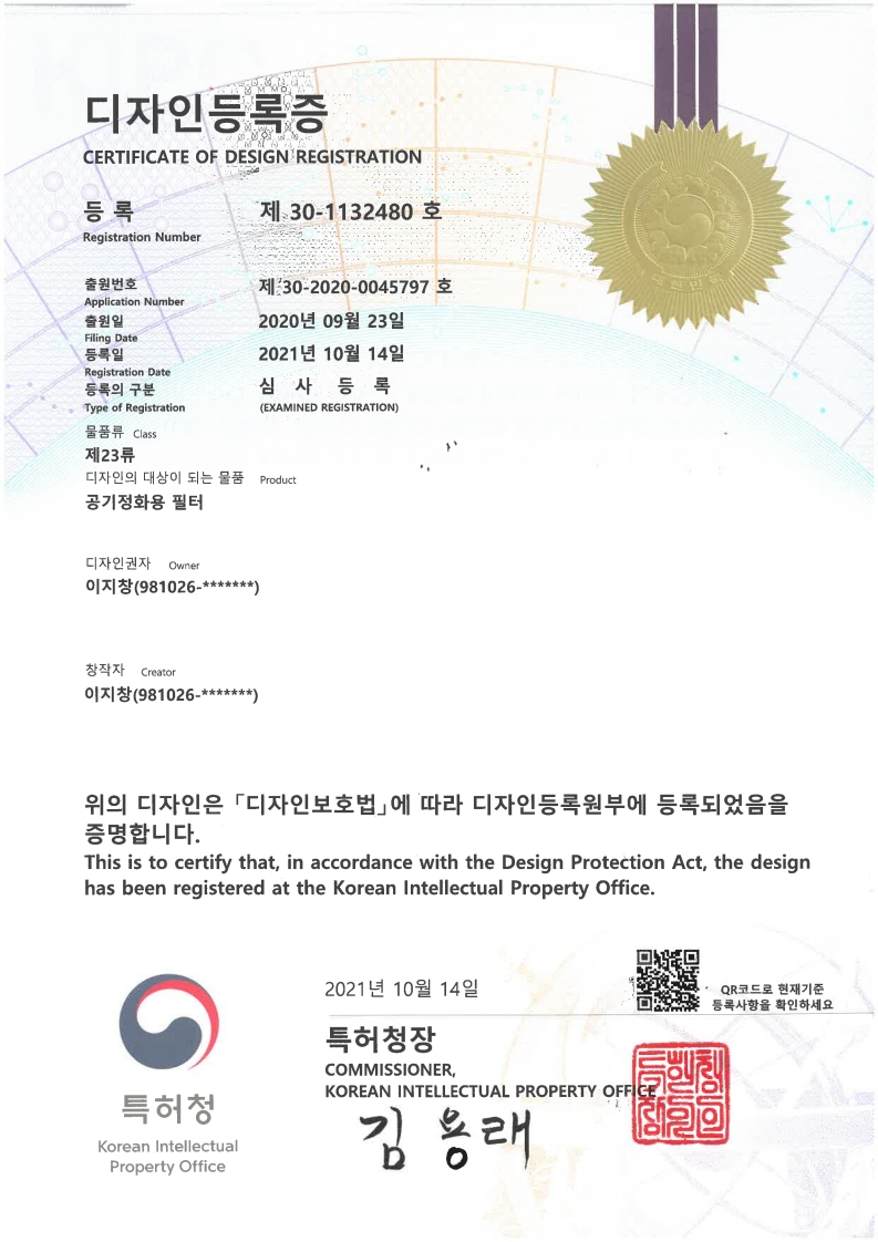 주식회사 니어스-(특허) 10-2296773 특허증 (액체도료 및 분체도료 입자 여과용 스크린 타입 필터)