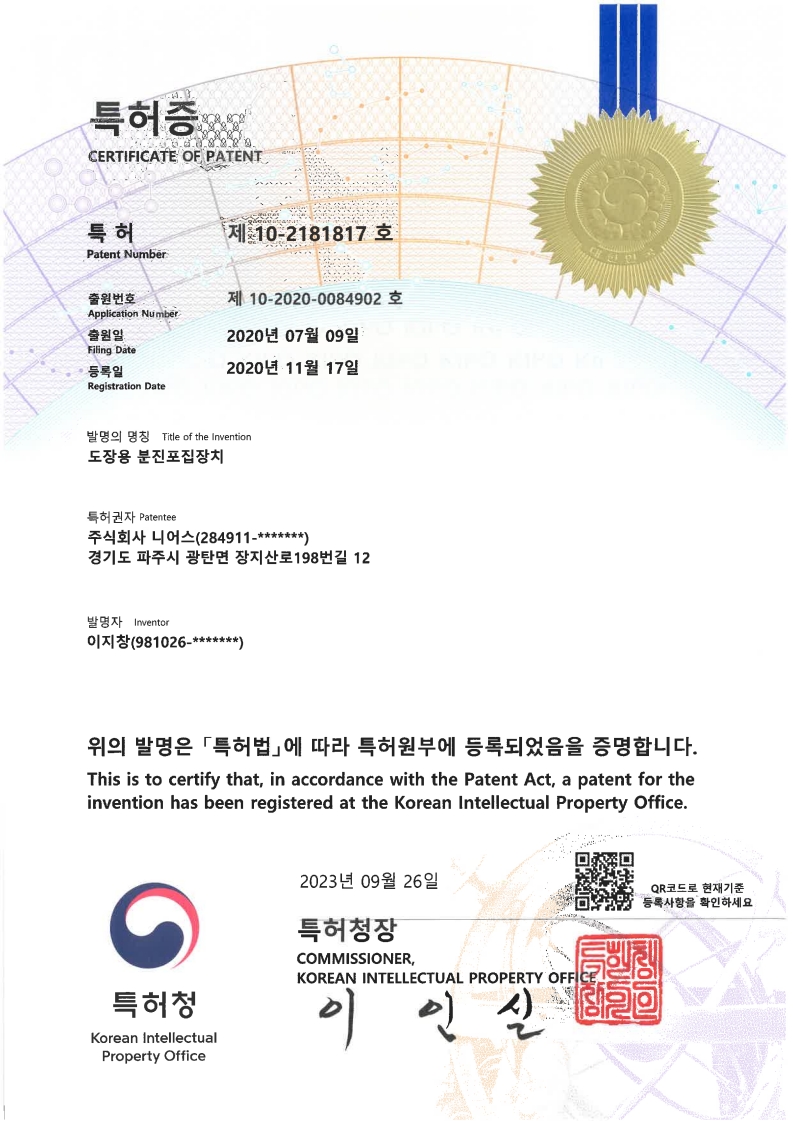 주식회사 니어스-(특허) 10-2181817 (도장용 분진포집장치)