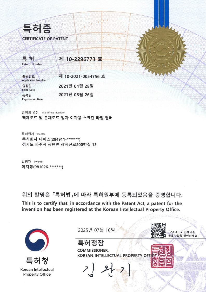 주식회사 니어스-(특허) 10-2296778 특허증 (액체도료 및 분체도료 입자 여과용 스크린 타입의 필터링 시스템)
