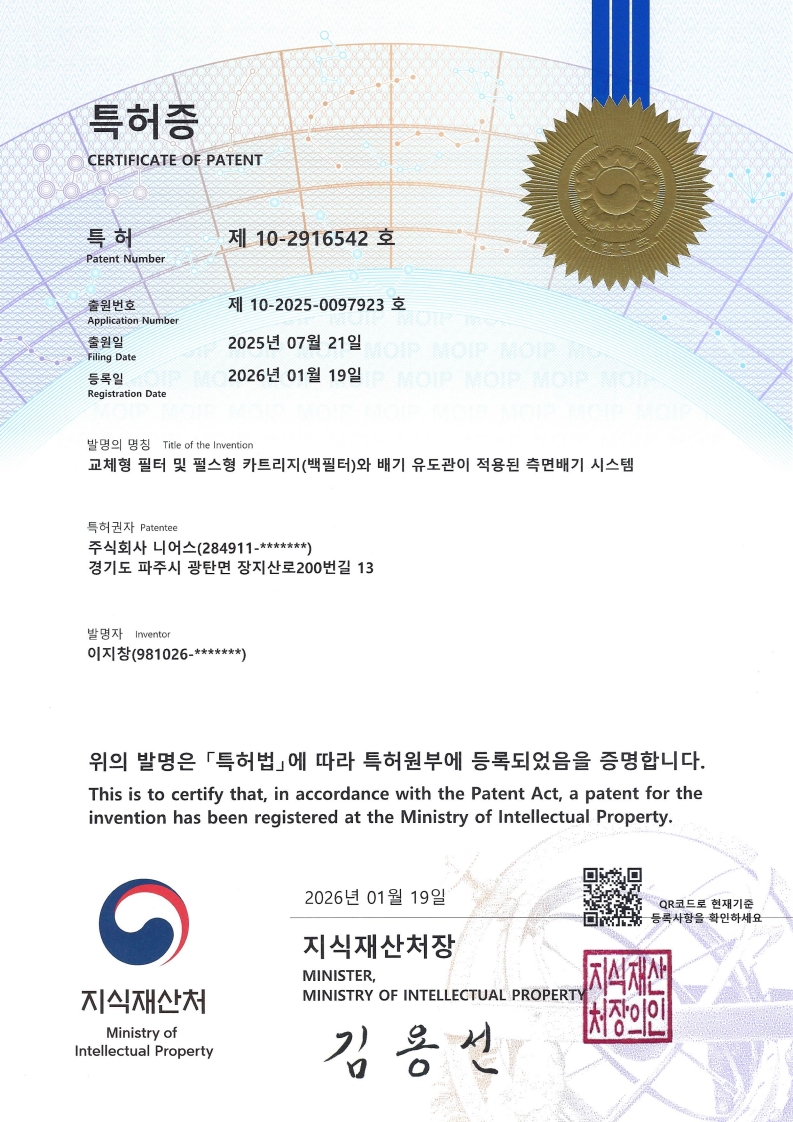 주식회사 니어스-(특허) 2026-10-2916542 (교체형 필터 및 펄스형 카트리지와 배기 유도관이 적용된 측면배기 시스템)